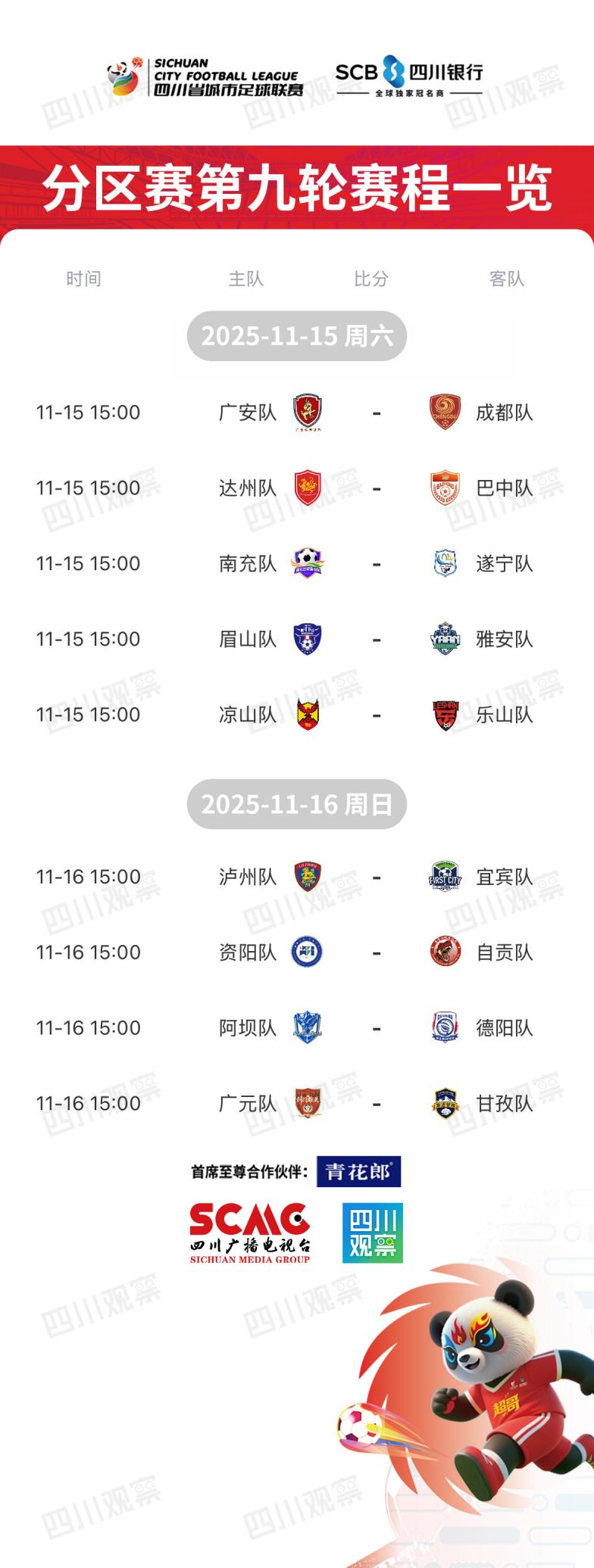 2025/2026四川银行四川省城市足球联赛(简称“川超”)分区赛第九轮将于11月15日开踢!本轮的9场对决将分别于11月15日(5场)和16日(4场)两个比赛日进行。为了方便各位球迷朋友观赛,观观整理了比赛日程,请查收!