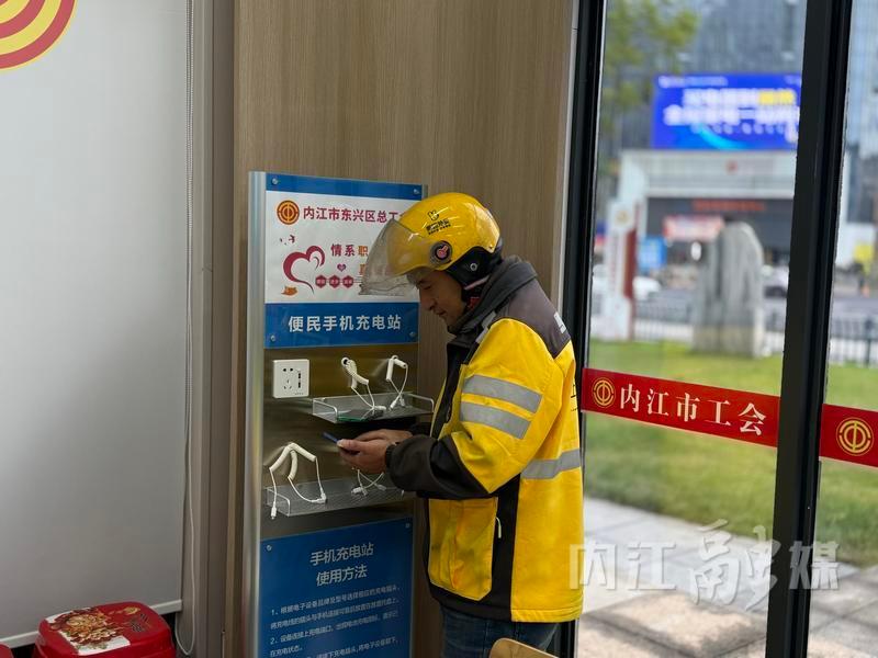 “我以前送外卖间隙只能在路边凑合歇会儿,现在有了工会驿站,能喝热水、热饭菜、充电。”11月17日,东兴区林荫大道工会驿站内,外卖员刘庆一边给手机充电,一边对驿站的便民服务赞不绝口。