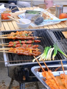 🔥 自助烧烤狂欢:几十种食材不限量供应,应有尽有,架起烤炉,炭火升温,油脂滋滋作响,撒上孜然与辣椒面,香气四溢。和亲友围炉而坐,边烤边聊,“满树霜红正好看” 的秋景作伴,烟火气中尽是团圆的欢喜。