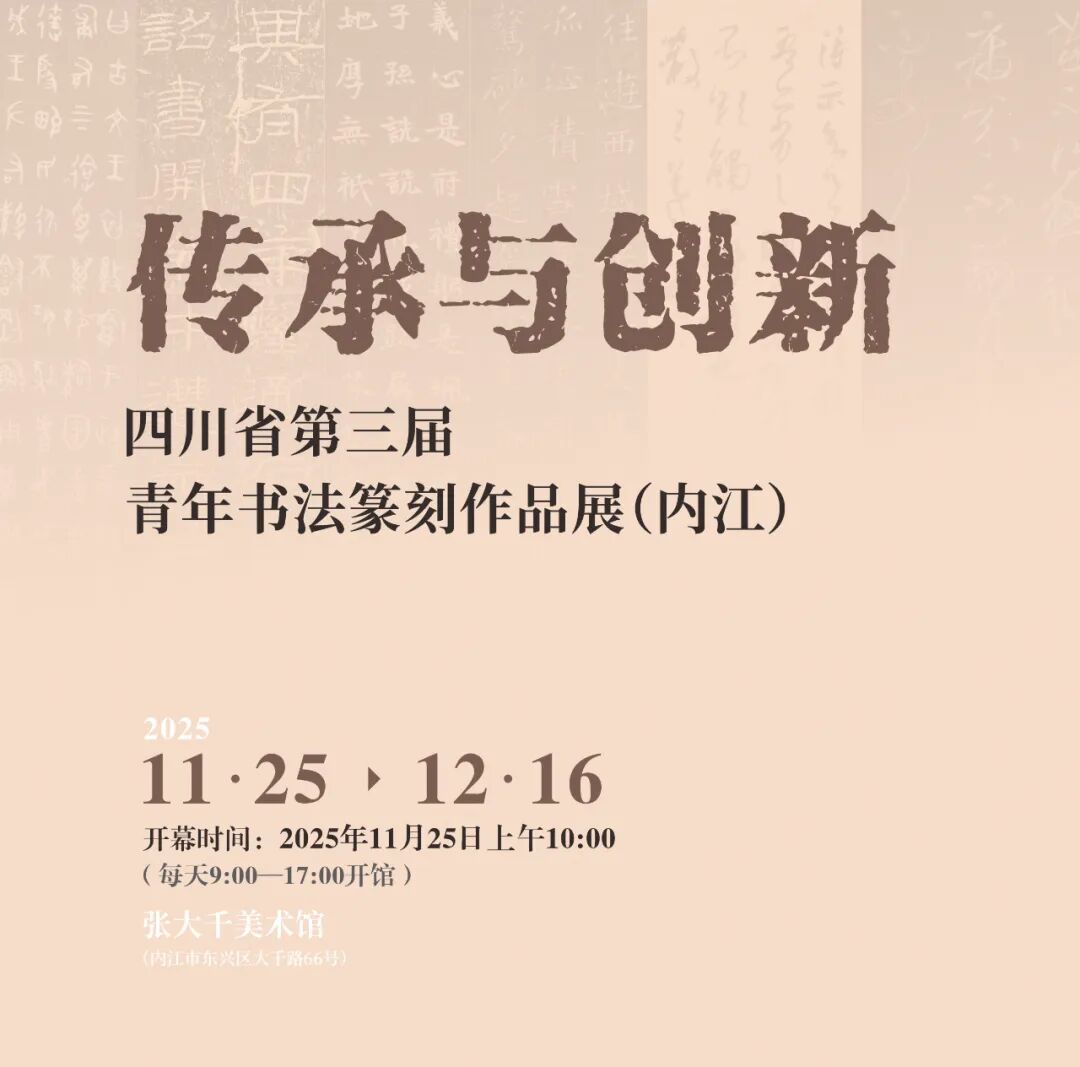 由四川省文学艺术界联合会指导,四川省书法家协会、中共内江市委宣传部、内江市文化广播电视和旅游局、内江市文学艺术界联合会主办,内江市书法家协会、内江市张大千纪念馆、张大千美术馆承办的“传承与创新·四川省第三届青年书法篆刻作品展(内江)”开幕式将于2025年11月25日上午10:00在张大千美术馆(内江市东兴区大千路66号)举行。