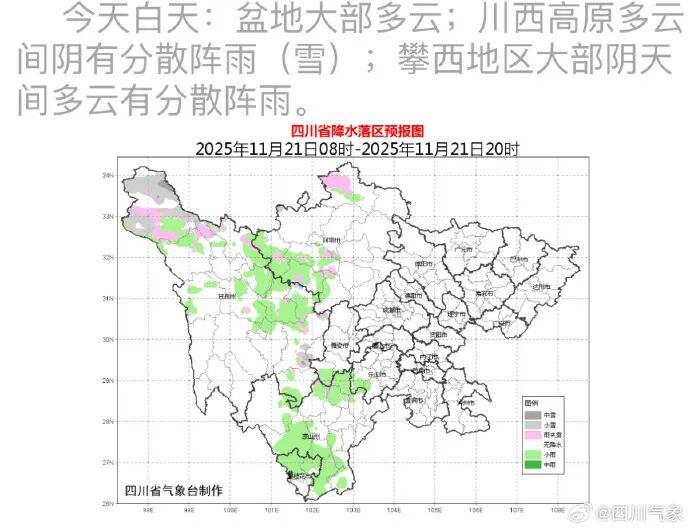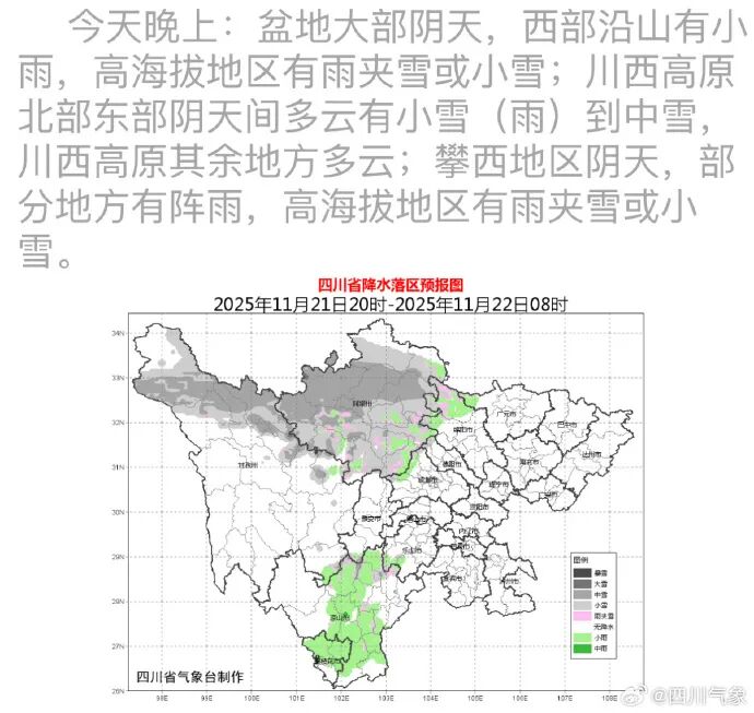 据四川气象,今天白天到晚上:盆地大部多云转阴,西部沿山有小雨,高海拔地区有雨夹雪或小雪;川西高原北部东部阴天间多云有小雪(雨)到中雪,个别大雪,川西高原其余地方多云;攀西地区阴天,部分地方有阵雨,高海拔地区有雨夹雪或小雪。24小时内,盆地最低气温:北部5~7℃,其余地方7~9℃;最高气温:15~17℃。