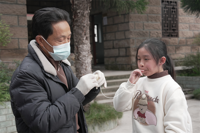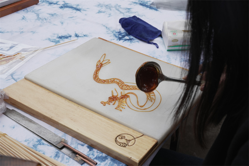 9岁的林芷玥在师傅指导下,手持一根糖线吹气,看着一条灵动的糖蛇在巧手翻飞间初具雏形,她兴奋地说:“吹糖人太有趣了,特别神奇!”