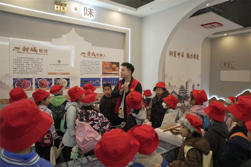 活动伊始,青少年们在带队老师的引导下,参观了蛋壳画、烙画、夏布绣、竹编等非遗展品。老师门旭结合内江文化与生活场景,生动讲解每项非遗技艺的起源、传承与特色,帮助孩子们了解传统工艺背后的文化内涵与地域特色,充分感受非遗魅力。