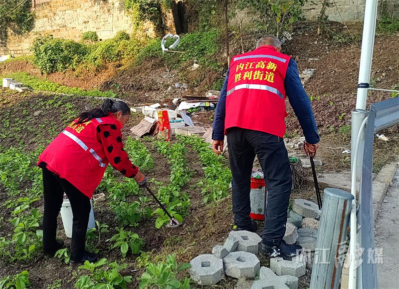 “大家加把劲,把这块杂草清理干净,再把垃圾桶归置整齐!”11月24日上午,内江高新区胜利街道联合社区的乡间小道上,铁锹碰撞地面的声响、扫帚清扫的沙沙声与党员干部的吆喝声交织在一起。连日来,内江高新区胜利街道“奋战一百天,干干净净迎新年”环境整治行动正如火如荼推进,通过集中攻坚,辖区环境面貌持续焕新。
