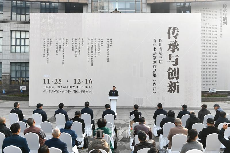11月25日上午,传承与创新·四川省第三届青年书法篆刻作品展(内江)在张大千美术馆开幕,笔墨飘香间尽显川蜀青年书法篆刻家的艺术才情与文化担当。