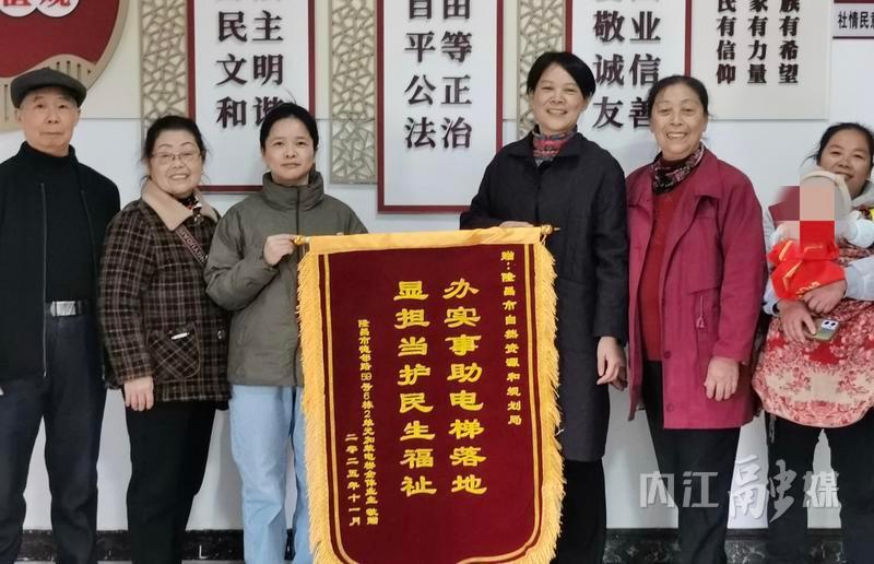 11月24日,隆昌市德邻路59号6栋2单元的居民代表专程来到隆昌市自然资源和规划局,向工作人员赠送一面写有“办实事助电梯落地 显担当护民生福祉”的锦旗,感谢该局在既有住宅电梯增设工作中主动作为、高效推进,切实解决小区居民“上楼难”问题。
