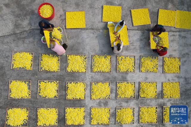 11月11日,四川省内江市光明村,村民在分拣刚采摘的菊花(无人机照片)。
