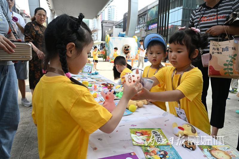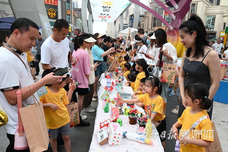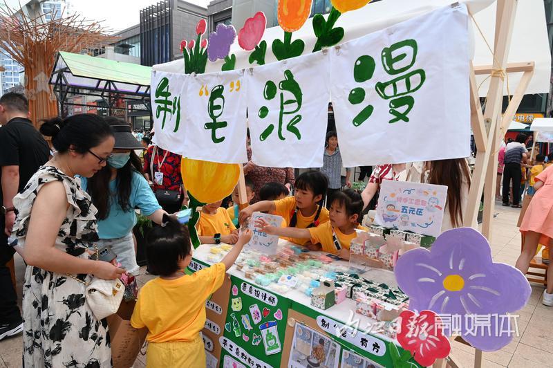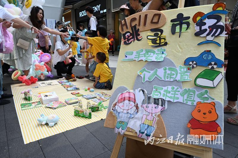 活动中,小朋友们纷纷将自制手工艺品和自家闲置的图书、文具、玩具等物品拿来义卖。在各自的摊位上,大家有条不紊地摆放商品,吆喝声此起彼伏,现场热闹非凡。