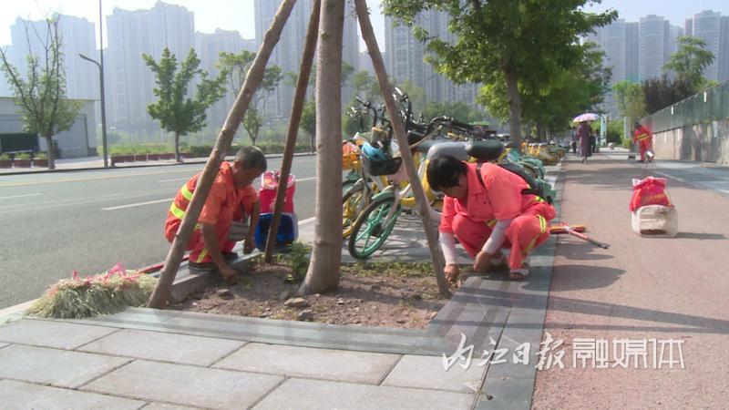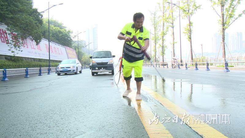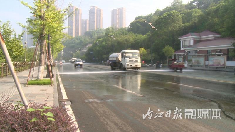 9月3日,记者在内江市东兴区兰桂大道和五星路看到,环境卫生保洁工作持续进行,清洁车辆正在冲洗道路,并对主次干道进行湿扫除尘作业,确保道路无积尘;环卫工人正在擦拭人行道护栏和旁边的垃圾箱,清理路面垃圾和落叶。
