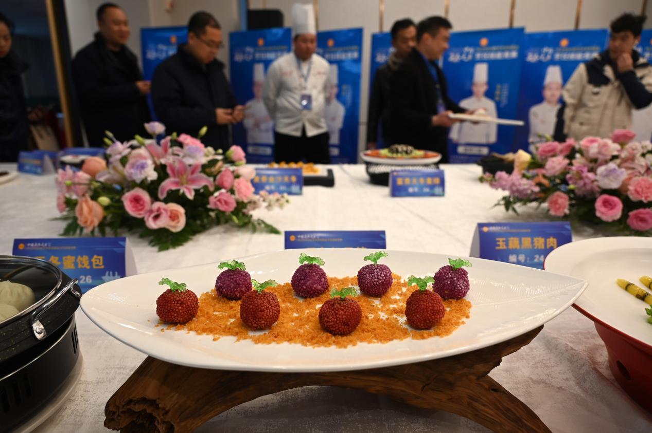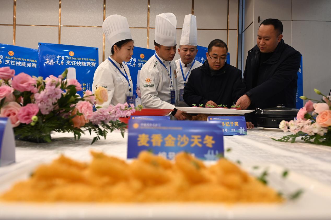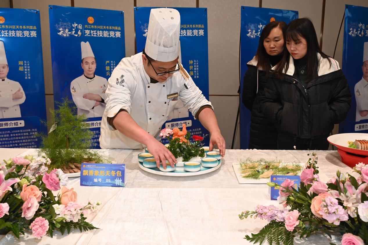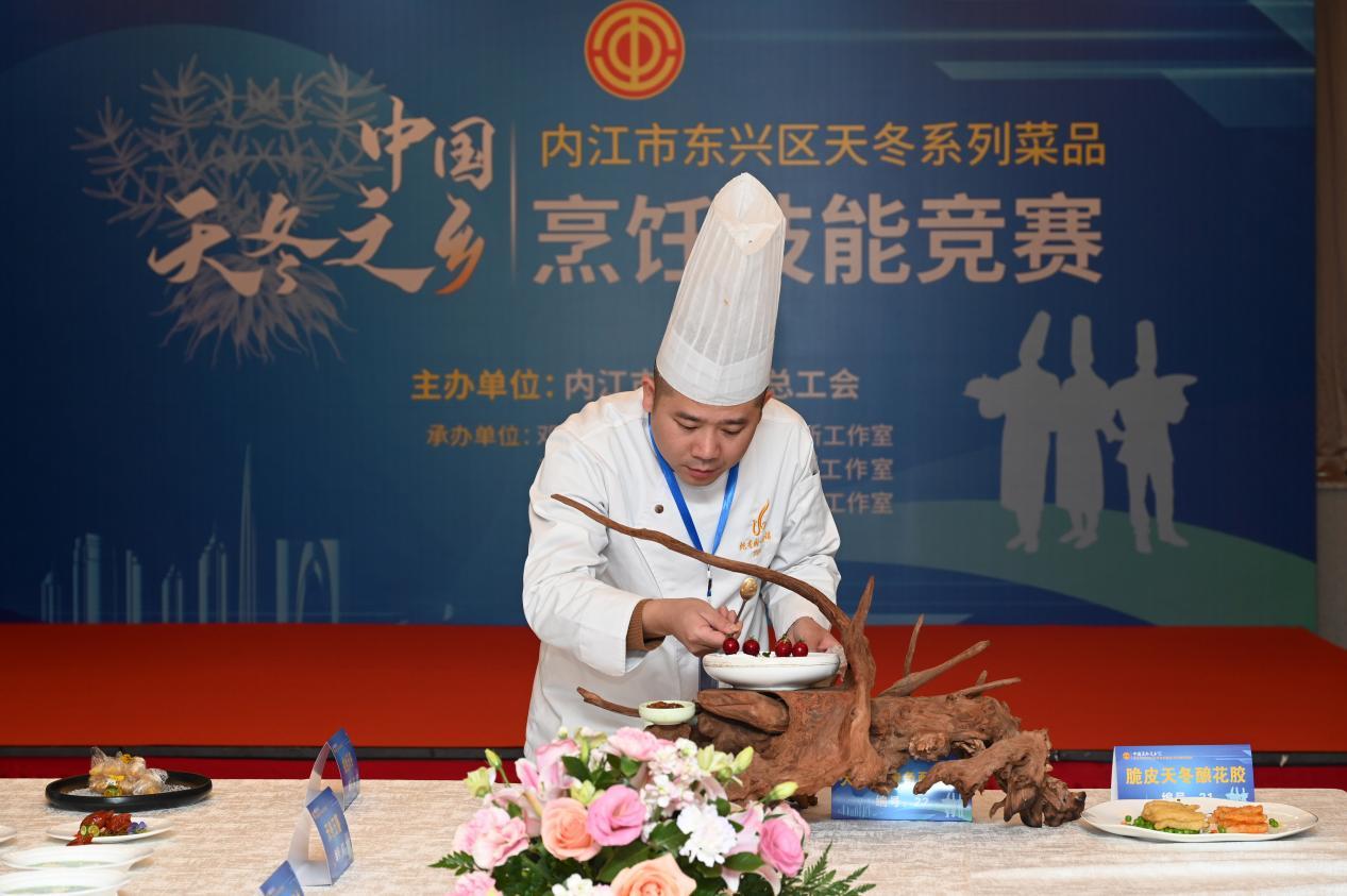 近日,在内江市东兴区烹饪技能比赛现场,参赛选手在展示厨艺。