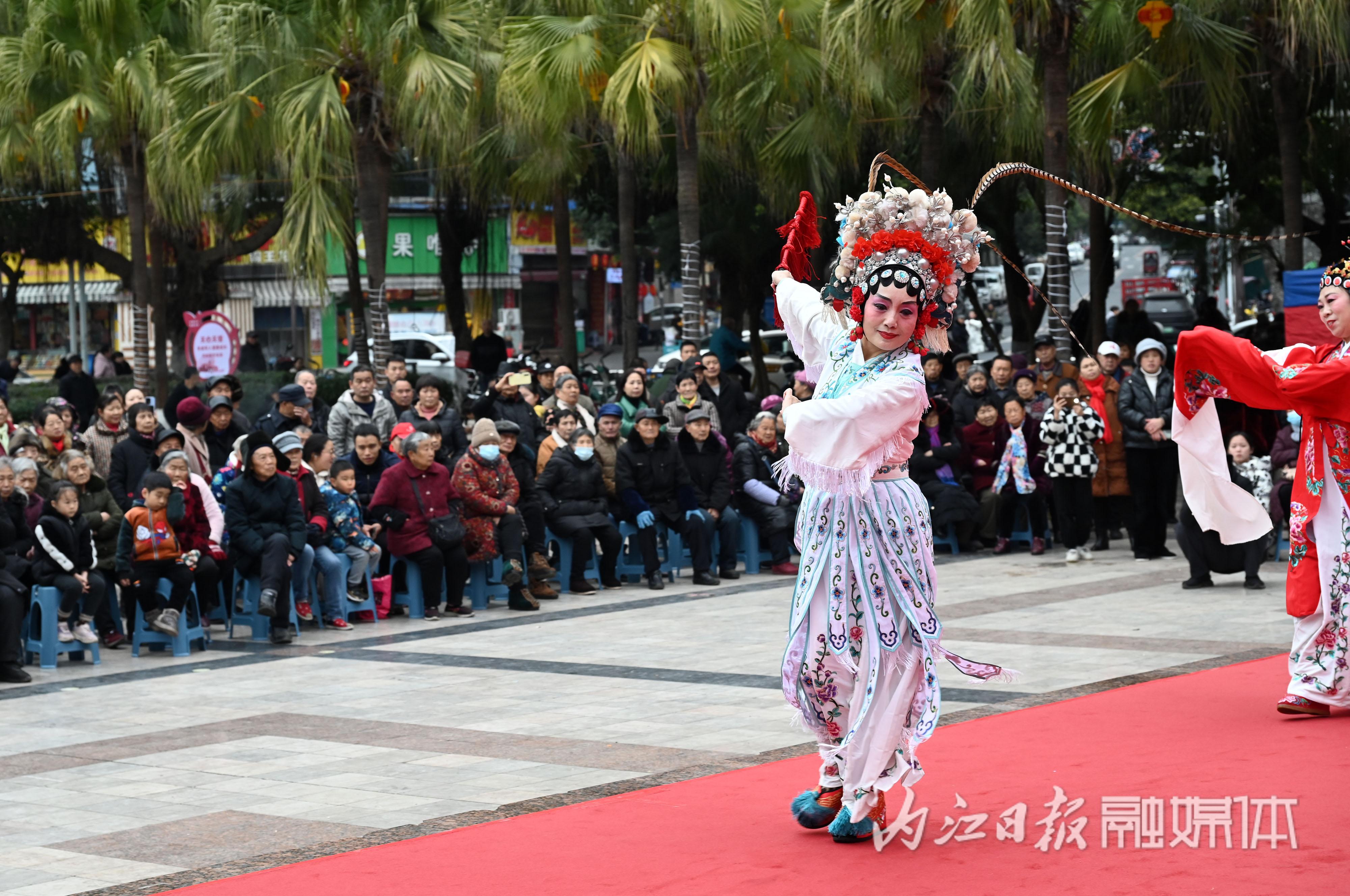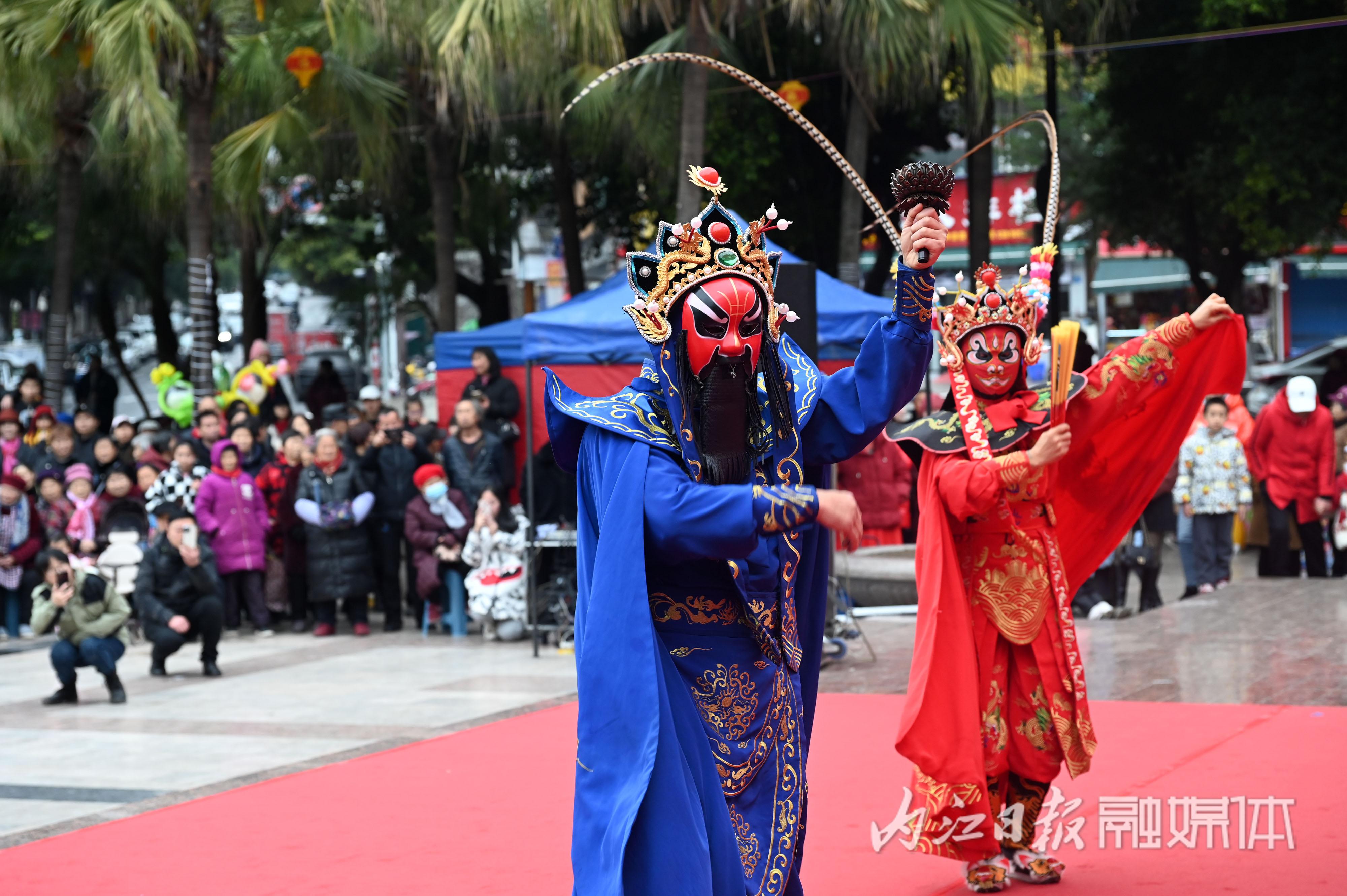 2月4日,川剧演员在内江市东兴区大千广场为群众表演川剧节目。