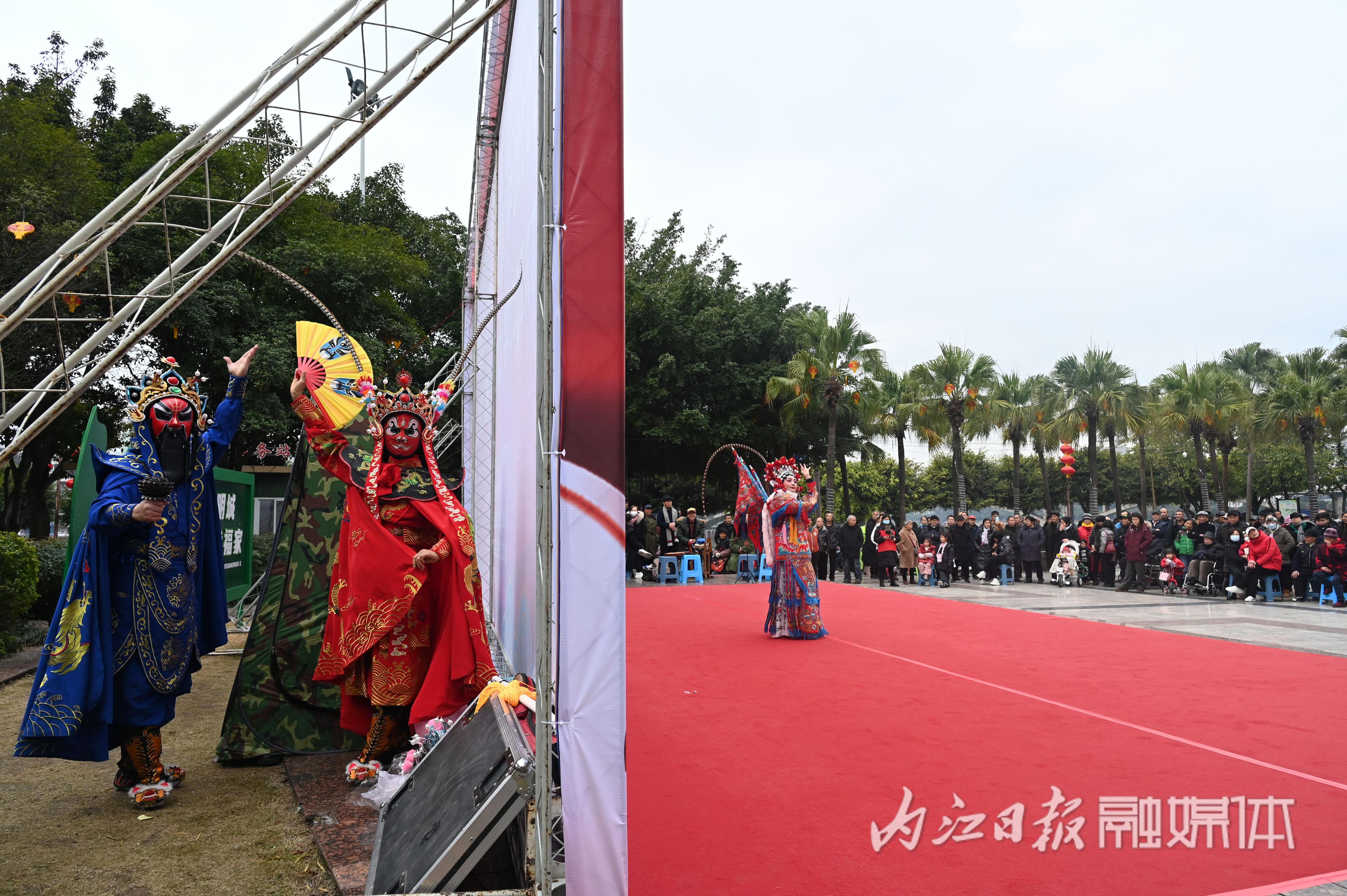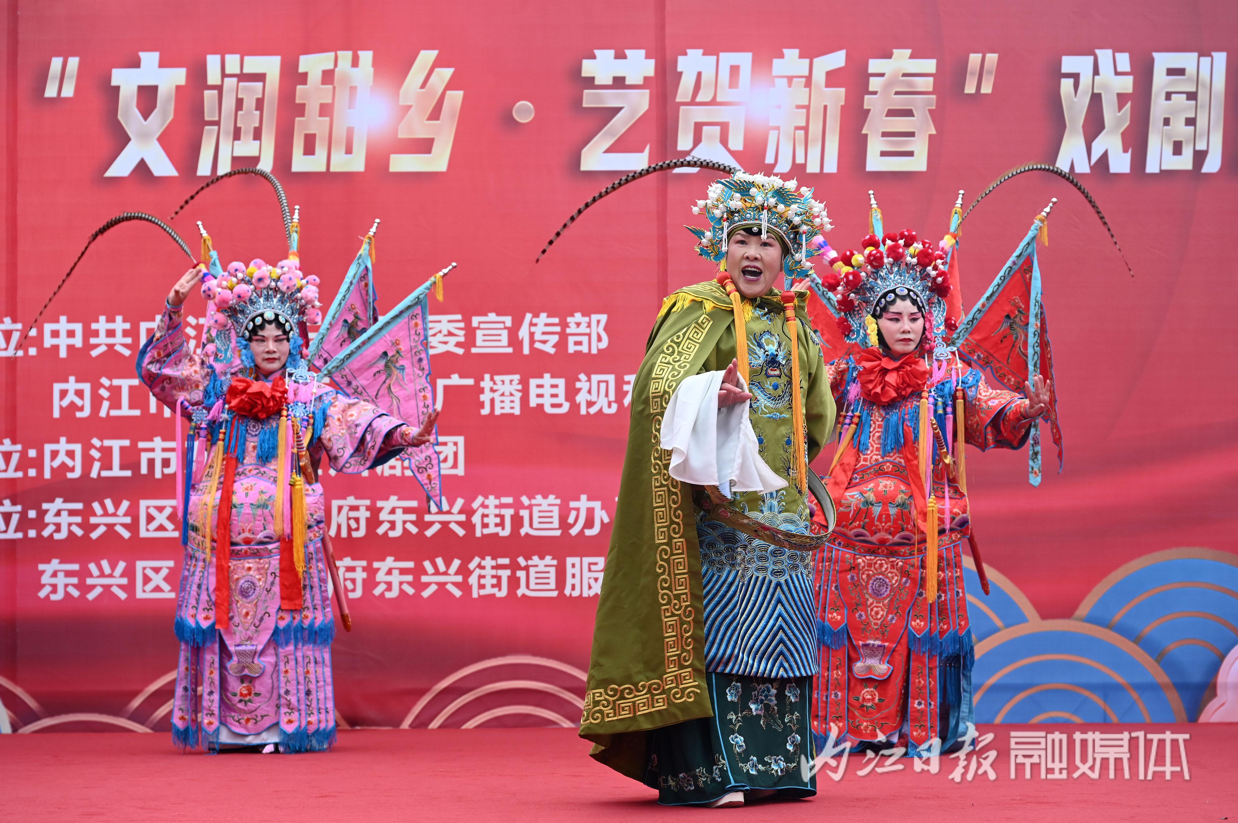 春节临近,东兴区举办“文润甜乡•艺贺新春”戏剧惠民演出活动,组织川剧演员走进大千广场表演川剧唱段和折子戏,让广大群众在家门口欢欢喜喜看大戏,开开心心迎新春。