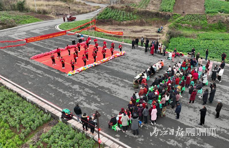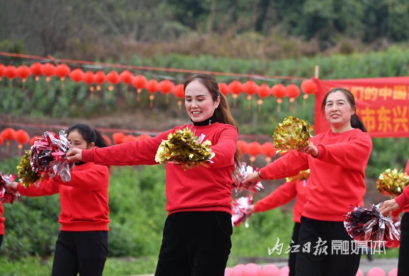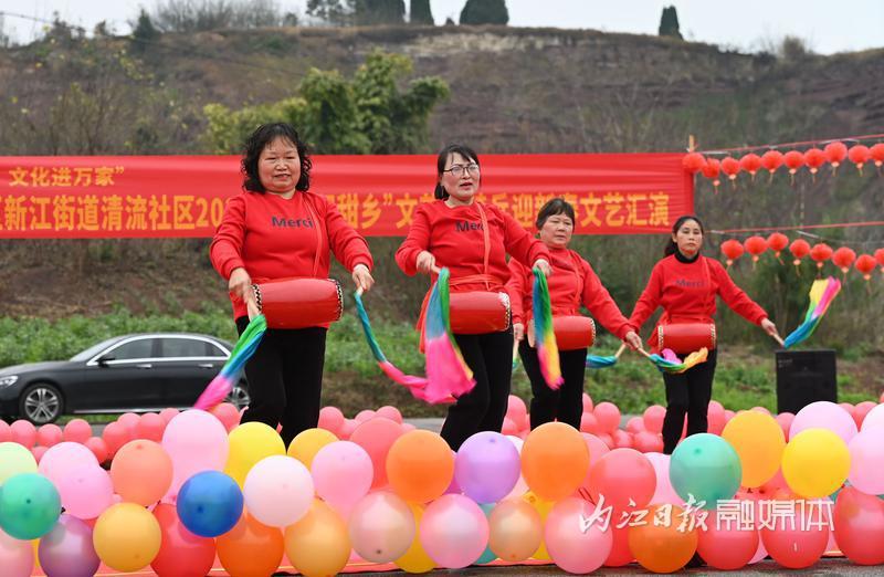 2月3日,内江市东兴区新江街道清流社区,草根艺术团队的演职人员载歌载舞喜迎新春。