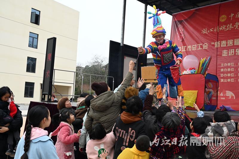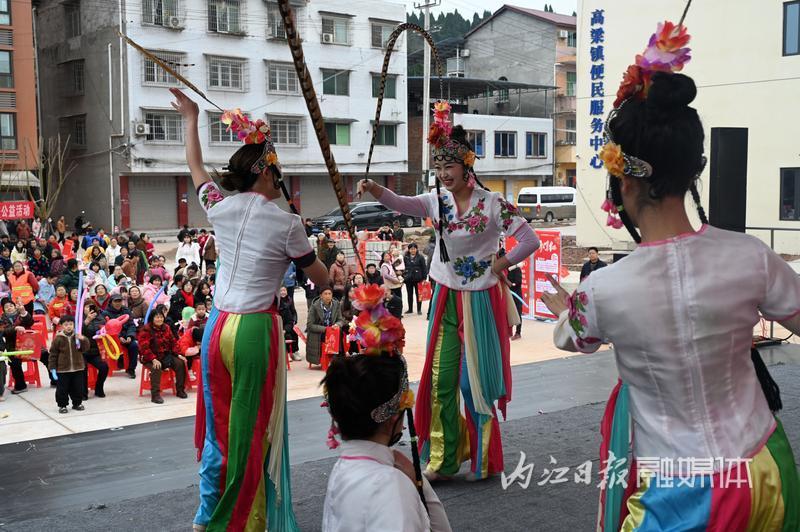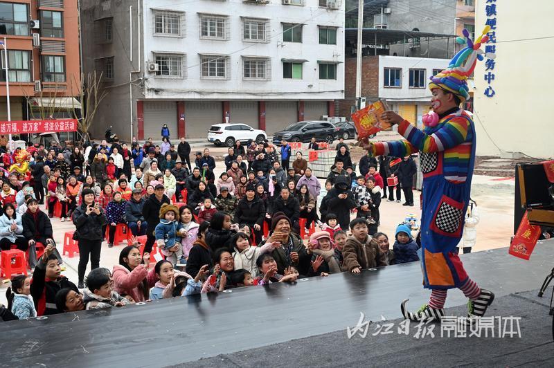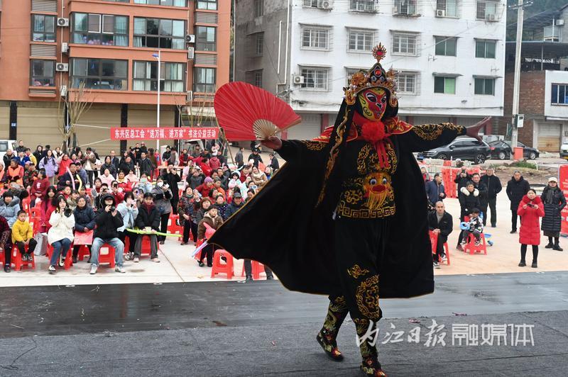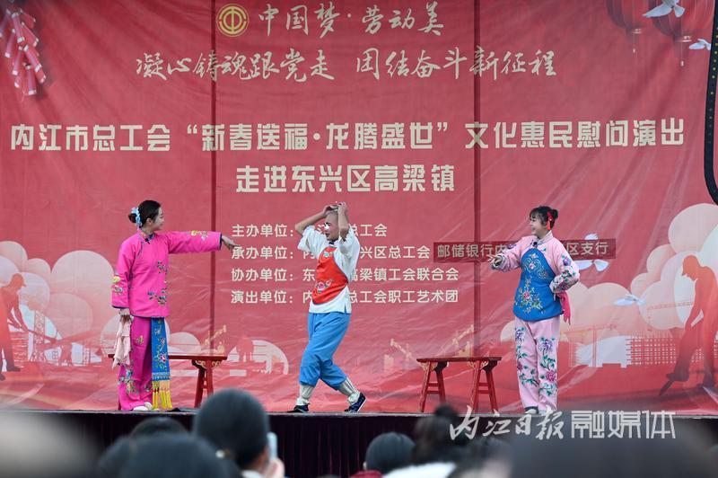 2月3日,内江市总工会“新春送福·龙腾盛世”文化惠民慰问演出走进东兴区高梁镇,将川剧折子戏、变脸、吐火、魔术表演等节目送到群众家门口,营造出欢乐、喜庆、热闹的迎新春氛围。