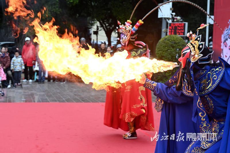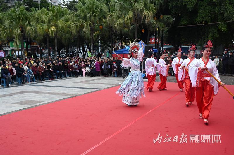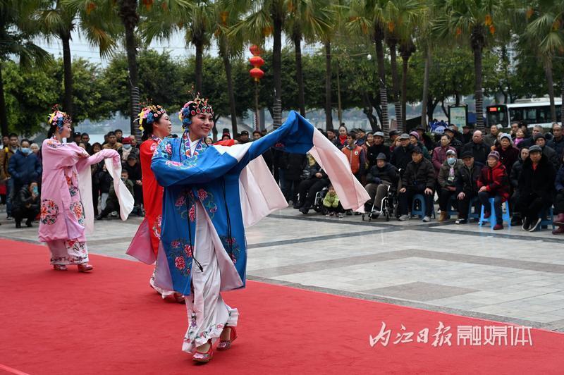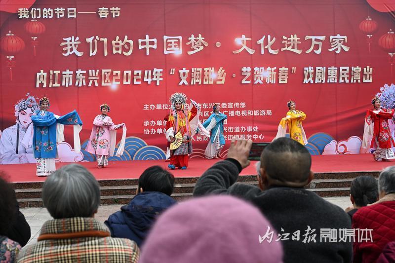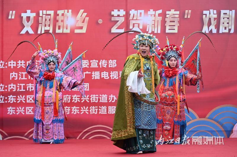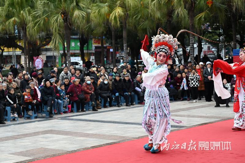 春节临近,内江市东兴区举办“文润甜乡 艺贺新春”戏剧惠民演出活动,组织川剧演员走进大千广场表演川剧唱段和折子戏,让广大群众在家门口欢欢喜喜看大戏,开开心心迎新春。