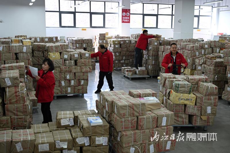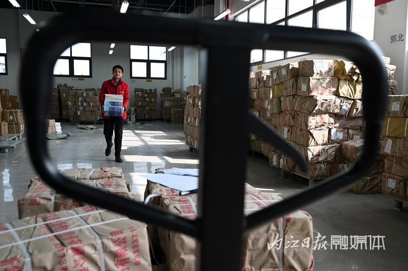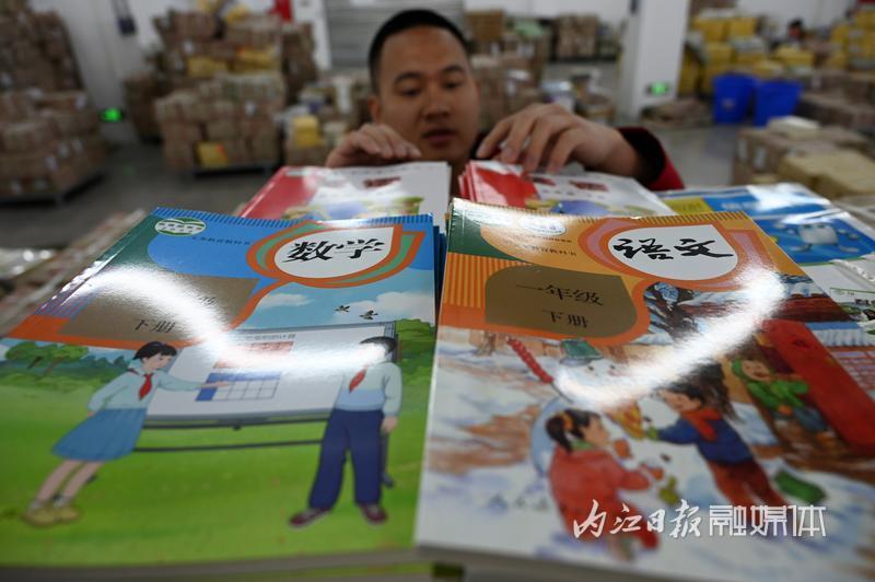 2月19日,四川新华文轩内江市东兴分公司教材仓库内,工作人员在忙碌地清点整理新学期教材。