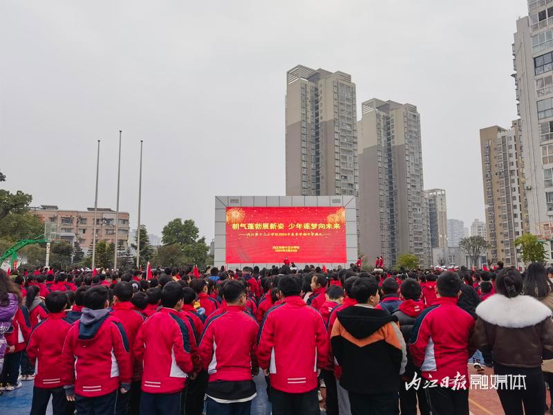 “升国旗,奏国歌!”随着一声令下,国歌奏响,五星红旗冉冉升起,同学们高唱国歌,内江市第十三小学校开学典礼在庄严的国歌声中缓缓拉开序幕。教师代表为全体学生作了热情洋溢的开学致辞,勉励全校学生从小立志报效祖国,养成良好的行为习惯,做品德高尚、自觉自律、知礼仪,懂礼貌的新时代好少年。学校领导发表开学致辞,鼓励全校师生在新的学期中勇敢前行、迎接挑战、勇攀高峰。