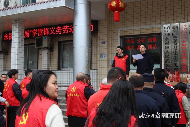3月5日,内江市东兴区永福镇组织镇村干部、民警、教师、医护等人员共60余人组成“攻坚队”,通过义务劳动的形式开展“学雷锋”志愿服务活动,弘扬“奉献、友爱、互助、进步”的雷锋精神。