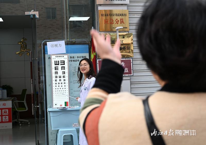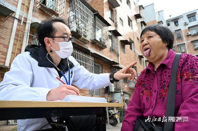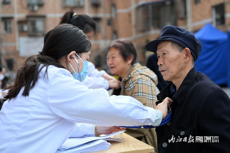 3月27日,内江市东兴区东兴街道凤凰社区,志愿者为社区老年人免费健康体检。
