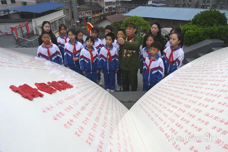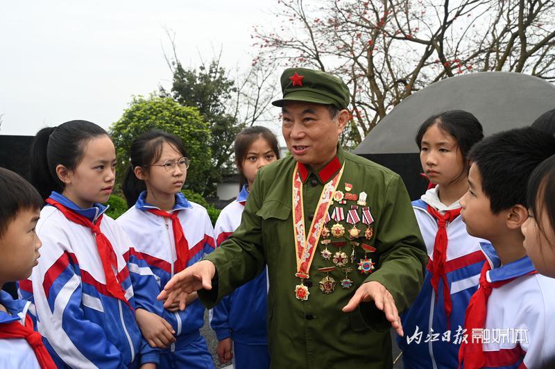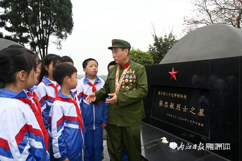 4月1日,在内江市东兴区双才烈士陵园,“五老”志愿者吴联邦正在向双才小学的学生们宣讲革命先烈的故事。