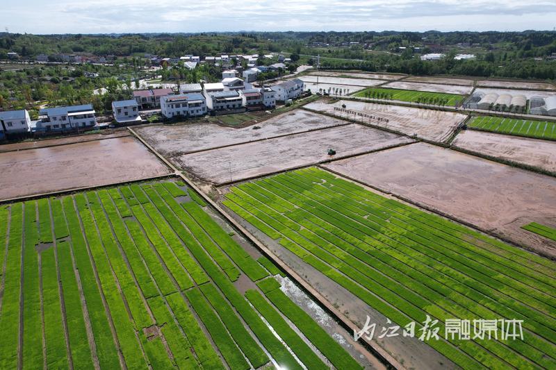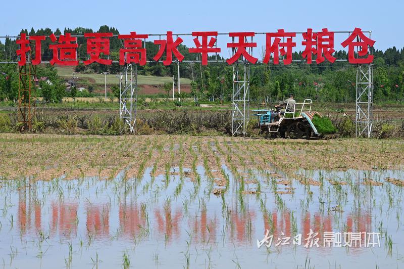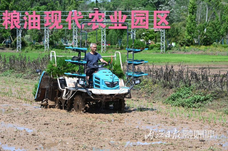 4月19日,在内江市东兴区长江现代农业园区,农机手驾驶插秧机在田里栽插秧苗。