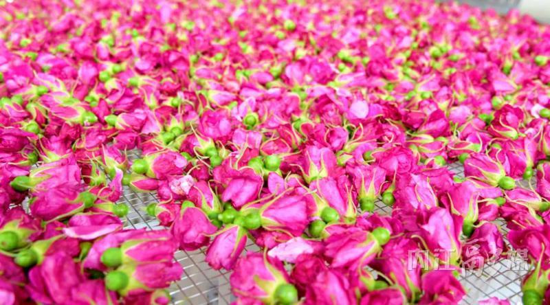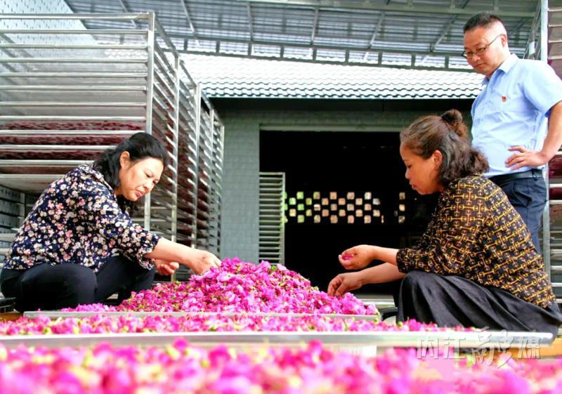 田间地头,村民们三五成群、挎筐拿袋,穿梭于玫瑰花海中,娴熟地采摘玫瑰花,一派繁忙的景象。烘干房里,驻村干部刘荣亮正查看采摘下来的玫瑰花,整个房间花香四溢。