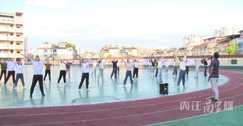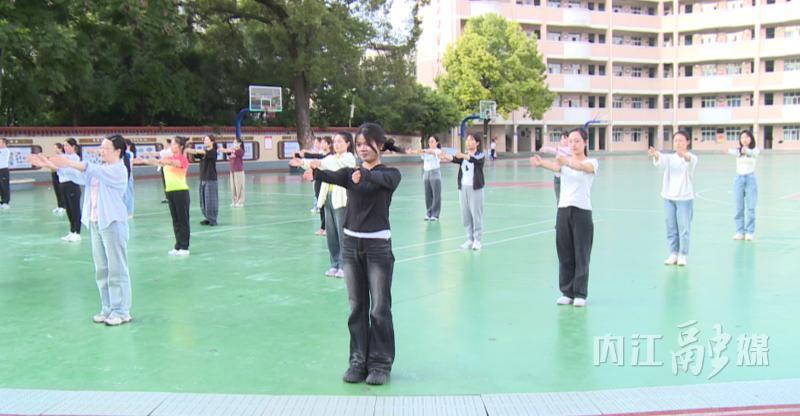 与此同时,在东兴区外国语小学校的操场上,参赛选手们正在进行全国第九套广播体操训练, 伴随着富有节奏感的音乐,整齐划一地做着每一个动作。伸臂、踢腿、转身,每一个细节都力求精准到位,展现出高度的纪律性和团队协作能力。