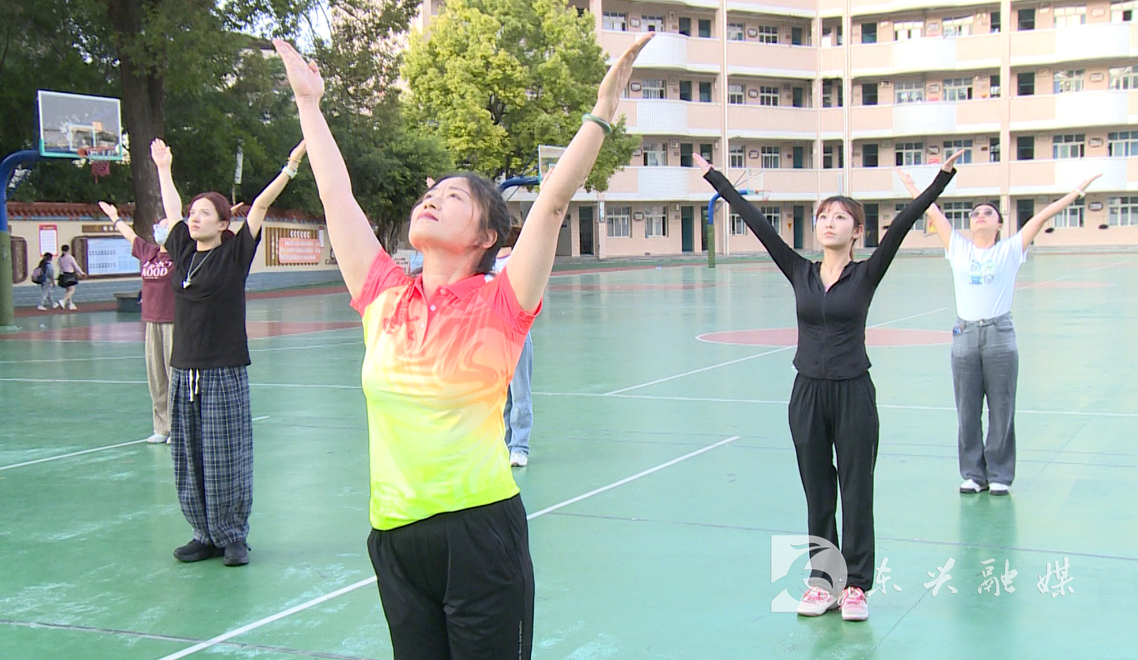 在东兴区外国语小学,代表东兴区参加市运会的老师们正在进行全国第九套广播体操训练,他们跟随着音乐,整齐划一地进行扩胸、体侧、踢腿等动作,虽动作简单,但老师们却格外认真,跟随教练口令做好每一个动作,一举一动间尽显团队凝聚力。据负责人介绍,很多老师都是刚刚下课便马不停蹄地从学校赶到训练场地进行训练,虽然给老师们带来了很多不便,但是大家从不抱怨,都在认真训练,为东兴区能够夺得好名次贡献力量。