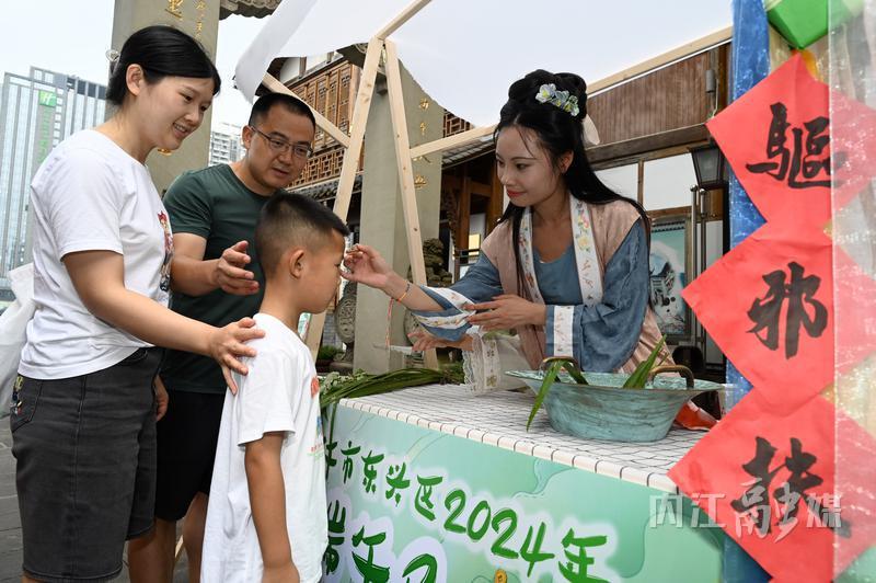 6月10日,在内江市东兴区东兴老街,景区工作人员正在为游客“点雄黄”。