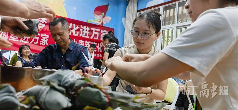 “粽叶飘香迎端午”现场,志愿者向居民介绍端午习俗,解读传统文化的深厚内涵。民间粽子达人讲解包粽子的技能技巧,让居民在学习中,感受粽叶香和糯米的芬芳。