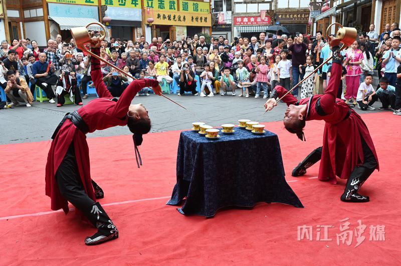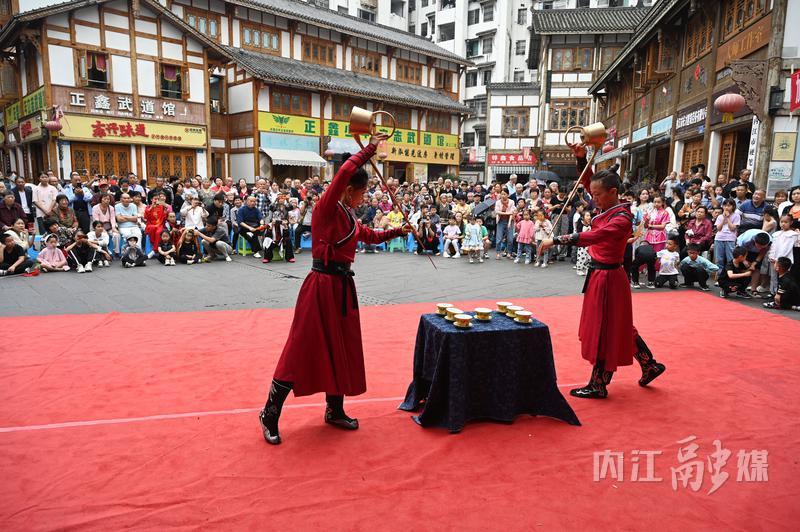 6月8日,游客在内江市东兴区东兴老街观看长嘴壶茶艺表演。