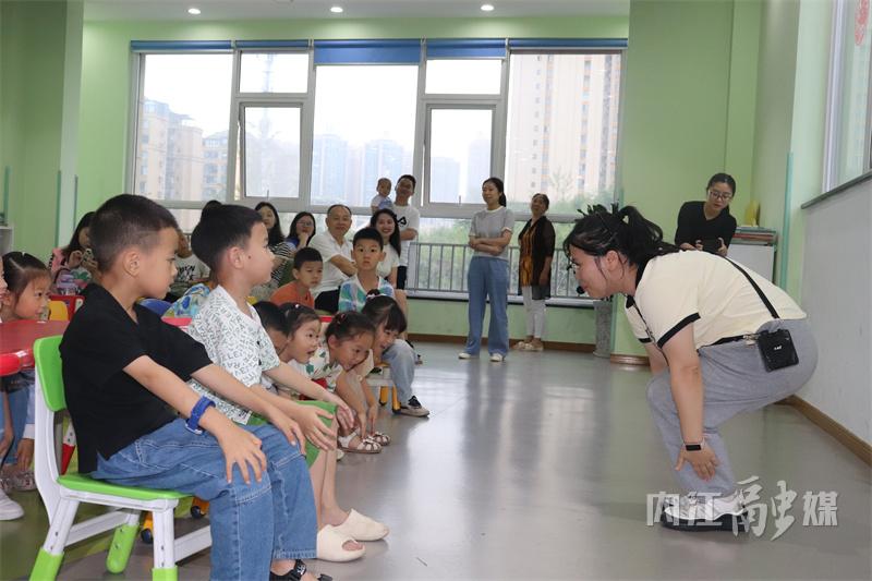 活动在“考反应”中展开。志愿者老师曹自然带领小朋友做四肢运动,摸头、触肩、抚膝……小朋友在运动中收获开心。