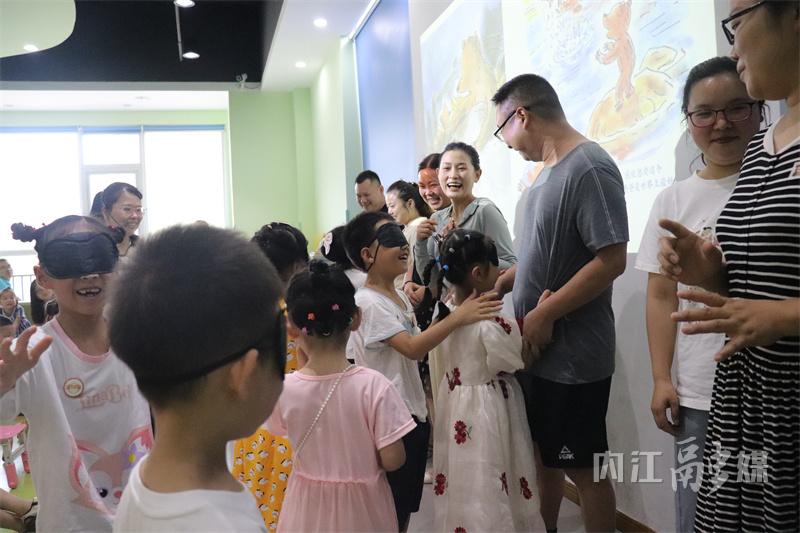 “蒙眼盲寻爸妈大冒险”将活动的欢乐氛围推向高潮。每个家庭中,孩子蒙上眼睛,转一圈后,寻找台上父母。寻找父母的过程中,孩子们通过感受父母手的粗细、衣服软硬和爸爸妈妈的味道,来辨别自己的父母,现场温馨且快乐。