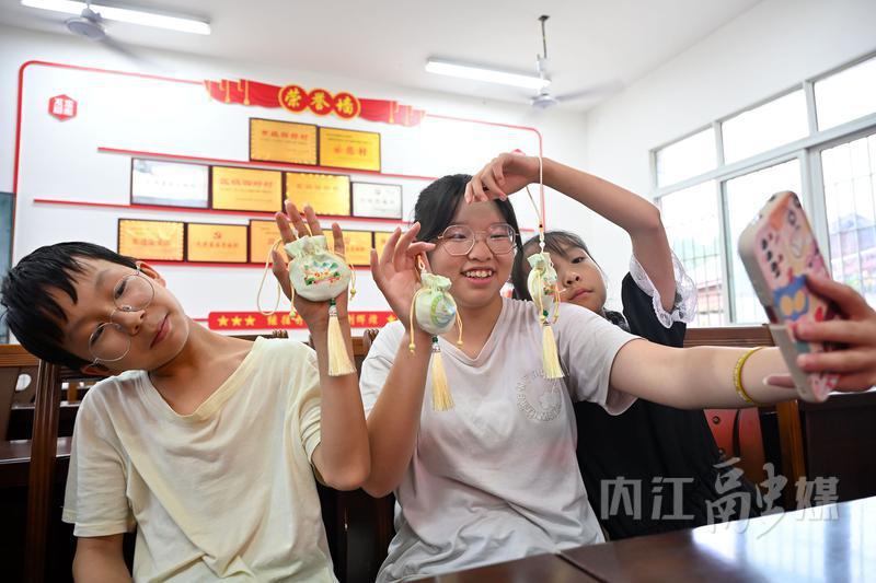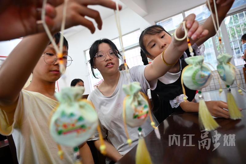 7月8日,内江市东兴区高梁镇方家沟村,留守儿童在公益“假期课堂”上学习制作中草药香囊。