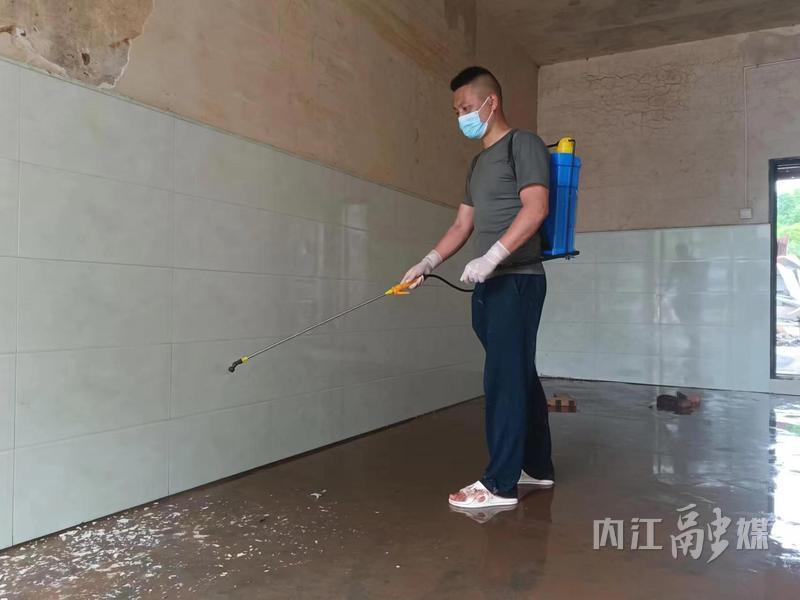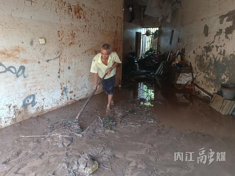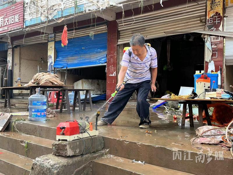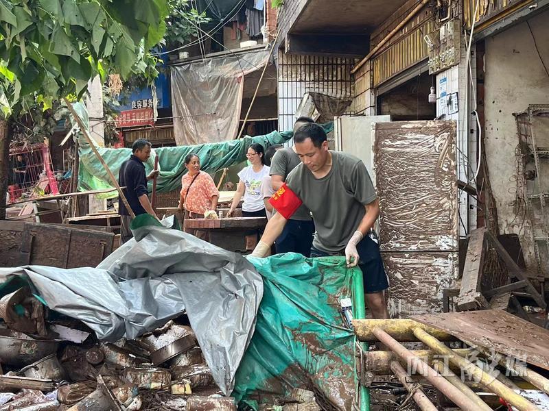 7月15日,在洪水消退后的东兴区白合镇苏家场镇片区,记者看到,临时避险转移安置的群众在镇村党员、干部的带领下安全返回家中,争分夺秒开展自救清淤工作。