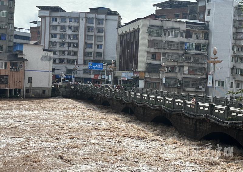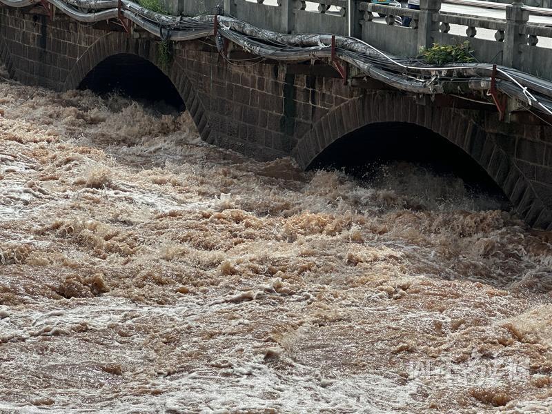 在郭北镇,河道内水势仍旧湍急,但水位正逐渐下降,相较于前一日的最高水位已下降了1米以上。河道上的下星桥桥面已恢复交通,车辆、行人可正常通行。桥两岸,郭北镇及北岸社区、南岸社区党员干部职工紧盯水位,待洪水退到警戒线以下,便将第一时间开展河堤清淤工作。