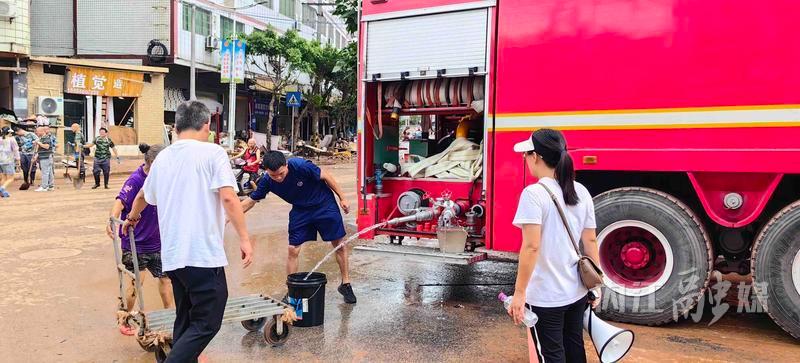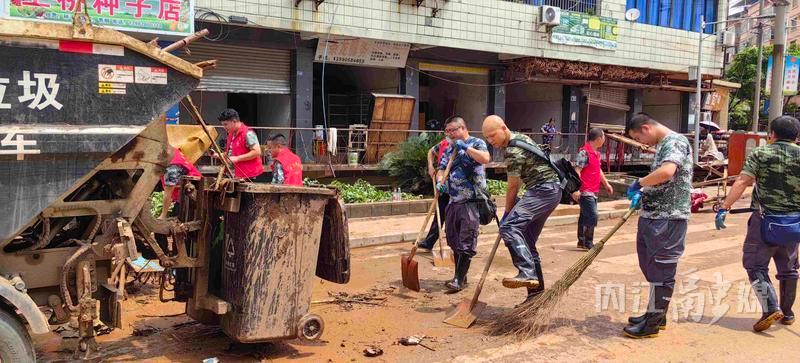 内江内投集团派出一支20余人的青年突击队一大早便来到了镇上,和大家一起进行清淤,他们还在当日下午调派来一台洒水车参与工作。