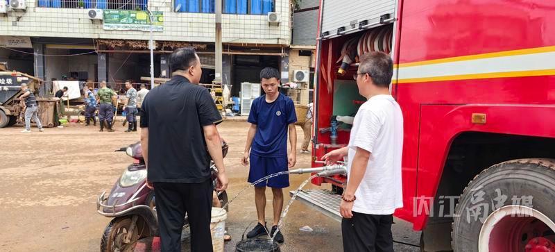 因为饮用水缺乏,内江市消防救援支队东兴区大队田家专职消防站消防员们一早便为居民送来了干净的饮用水,四辆消防救援车变身“送水工”轮轴转。据专职消防站相关负责人介绍,截至当天中午,他们已相继为居民送水40多吨。记者离开时,消防送水工作仍在进行。
