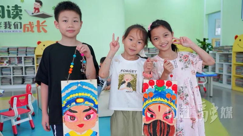 “今天外婆带我和妹妹来这里画画,我画的是一幅‘末’,觉得画得还不错。”“我今天跟妈妈来这里画了一幅脸谱,它叫‘旦’,我觉得很好看。”……画好后,小朋友们纷纷展示自己的作品,开心地交流。