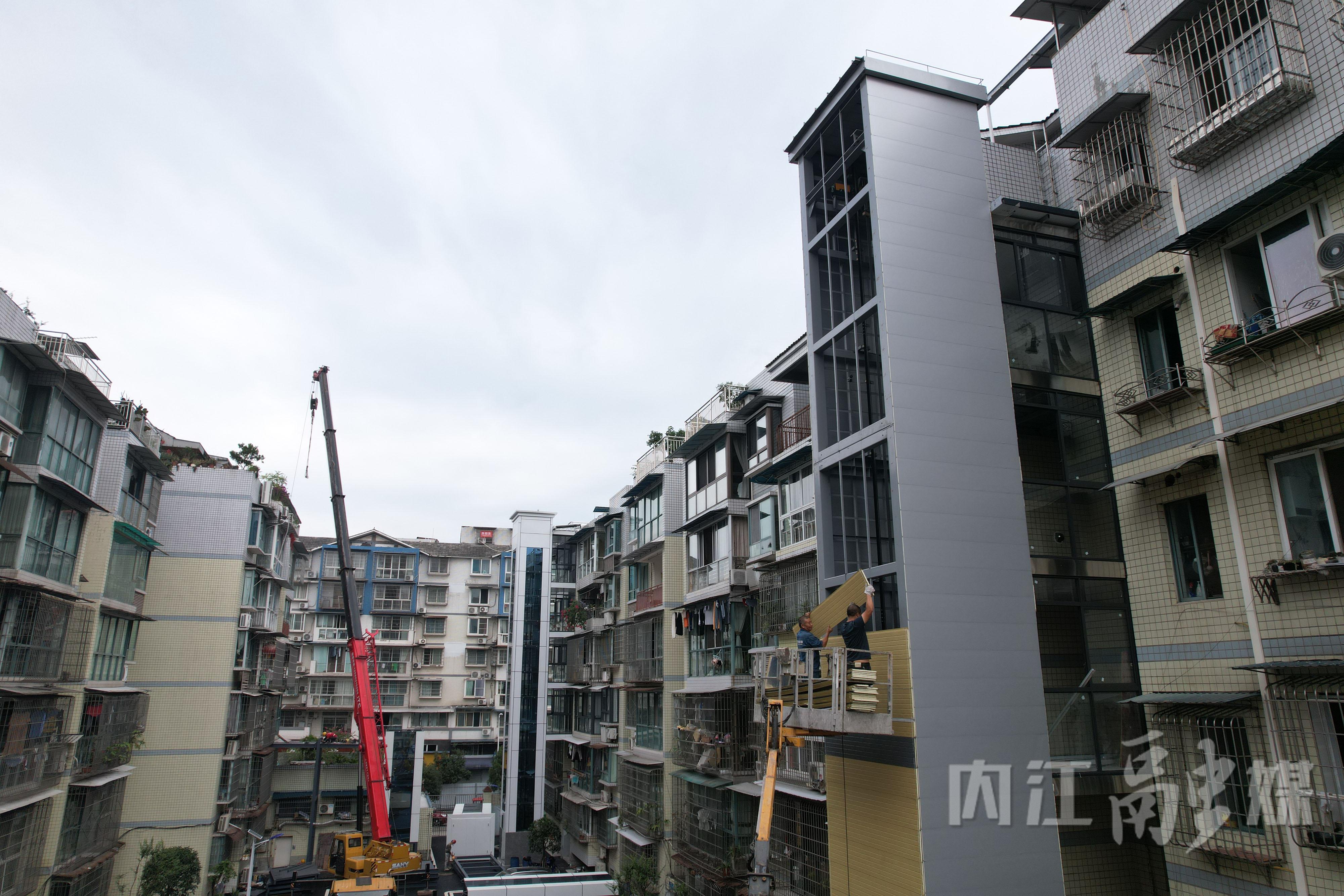 7月29日,内江市东兴区西林街道德馨苑小区几栋既有住宅正在加装“外挂”电梯。