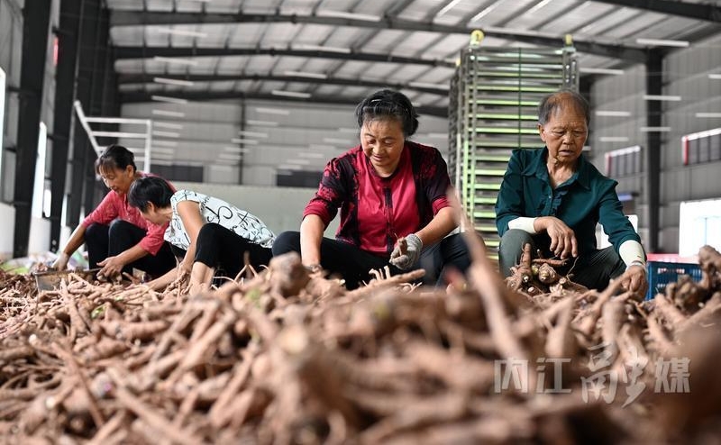 7月30日,内江市东兴区永福镇中药材加工中心机器轰鸣,工人们认真筛选白芷,分别放在置物架上,随时准备进行烘干加工。