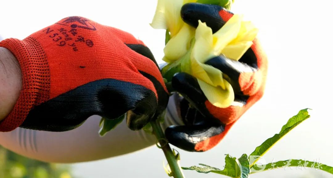 “我今年承包200亩土地栽种黄蜀葵,采取订单种植的模式,销路不愁。现在长势正好每天,组织30多名村民进行采摘,一天最多可以摘3000斤鲜花。”基地负责人刘光兵告诉记者,当前黄蜀葵公司收购价为18至19元,可采摘至10月初,丰花期日收入能达6000元。