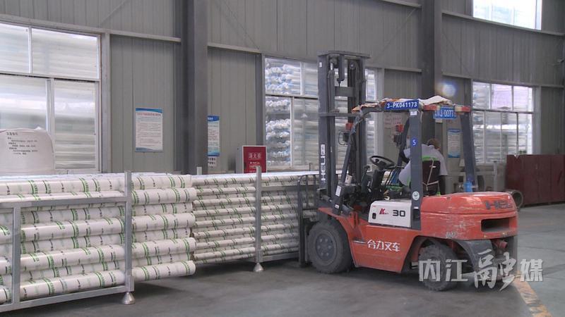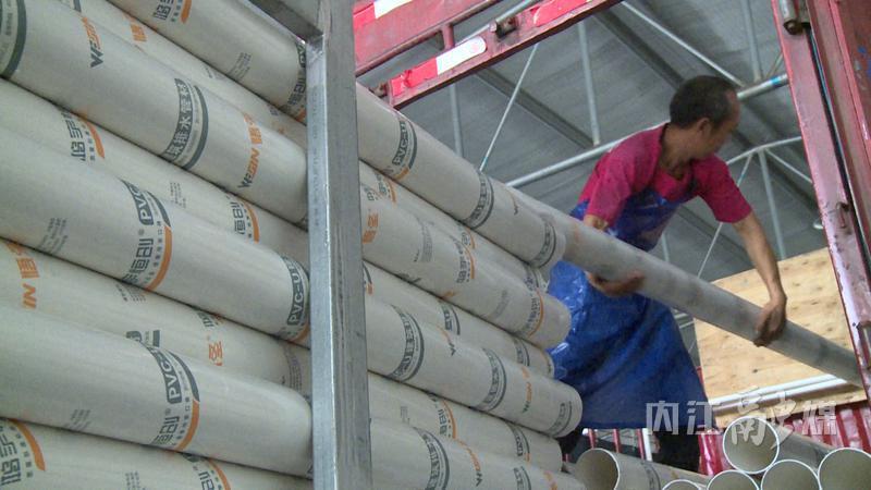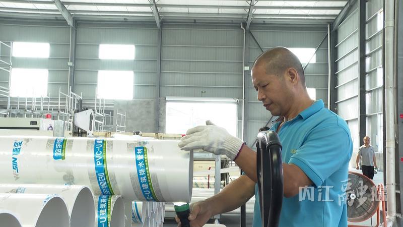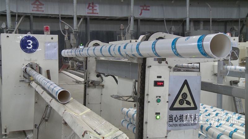 车间内,叉车来回穿梭,工人们在各自的岗位上忙碌着,自动化智能设备高速运转,机械轰鸣声中,一根根崭新的塑料管从生产线上不断“吐出”。