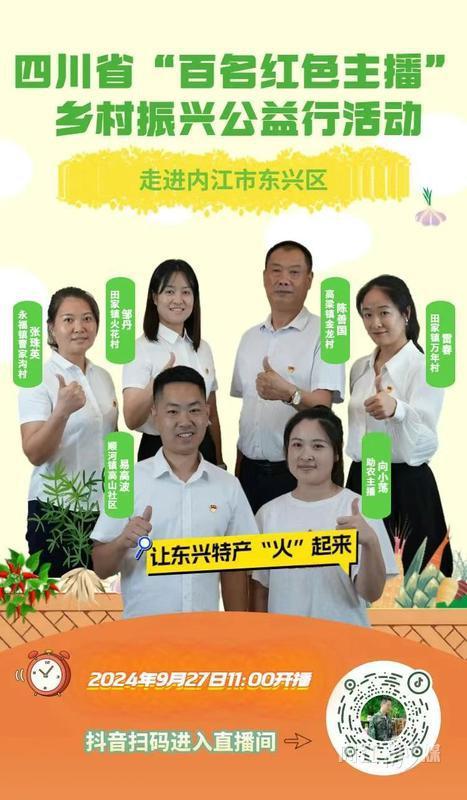 9月27日,四川省“百名红色主播”乡村振兴公益行活动走进内江市东兴区。五位特色产业村的“新农人”带着自己村的特色农产品走进直播间,让更多人认识东兴、了解东兴,享受“舌尖上”的东兴味道。