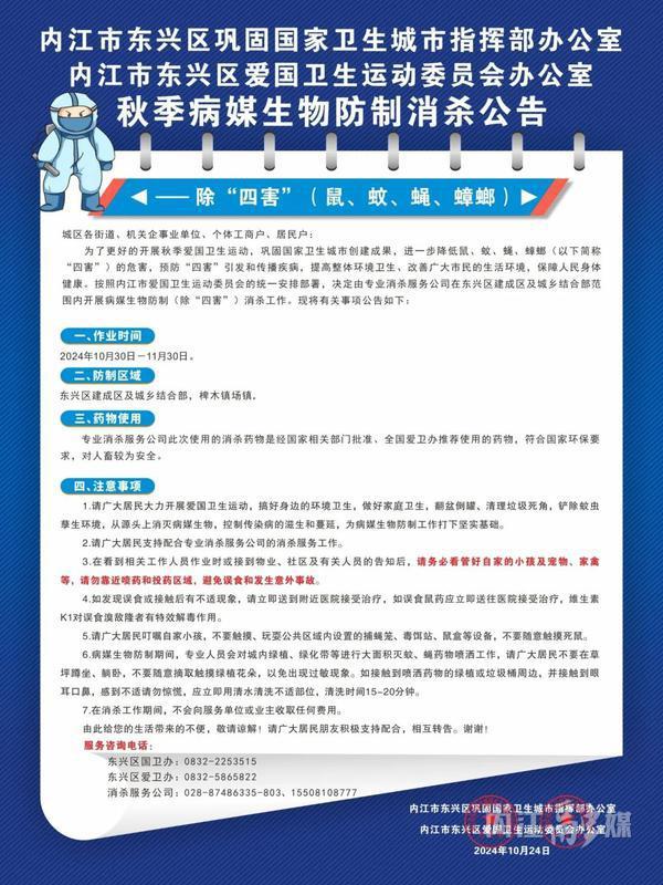 10月30日,东兴区正式启动秋季病媒生物防制消杀行动,旨在进一步优化城市环境卫生,降低鼠、蚊、蝇、蟑螂等病媒生物带来的健康风险。