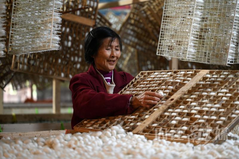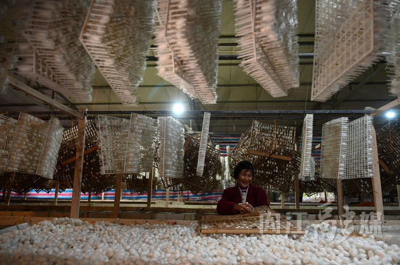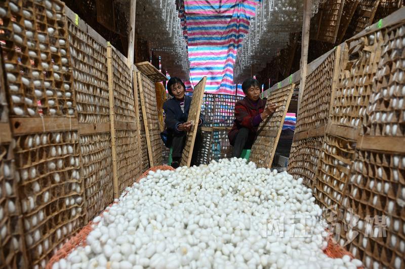 当日,东兴区双桥镇最后一批晚秋蚕茧迎来采收季,蚕农们忙着采收蚕茧,蚕房里一派繁忙景象。