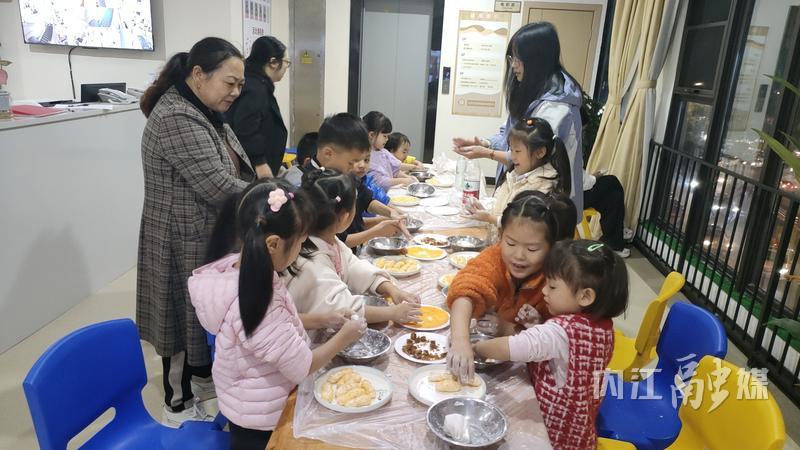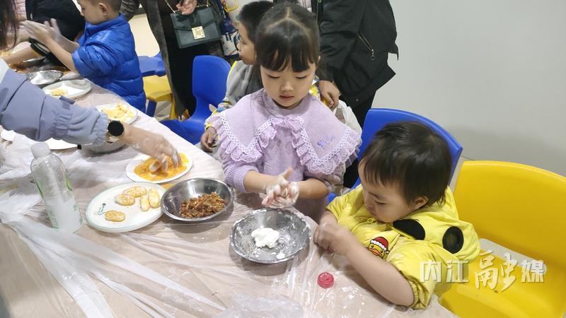 “哪位小朋友知道,在‘小雪’这天,我们要吃什么美食?”“红糖糍粑!”随后,小朋友们与志愿者一起制作红糖糍粑,只见小朋友们取一小团糯米面搓成球,再制作成饼状,包入红糖馅,最后搓成各种形状,经过大家的一番努力,一盘盘红糖糍粑做好了,小朋友和家长一起品尝自己的劳动成果。