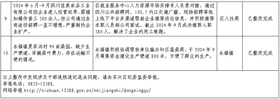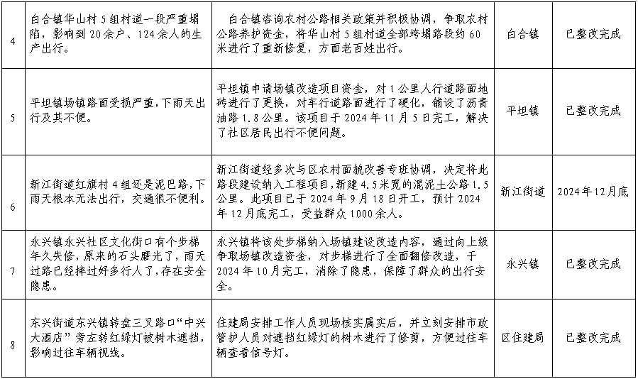 为切实解决群众的急难愁盼问题,近期,东兴区通过纪检监察干部走访、流动接访、小微权力“监督一点通”平台、12345政务服务便民热线、各单位主动收集等方式,全面收集群众意见建议后,对群众反映的10个典型问题进行整改。现将整改情况公示如下,欢迎广大群众积极建言献策。