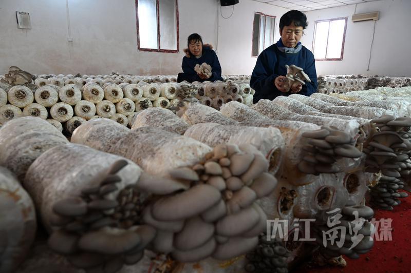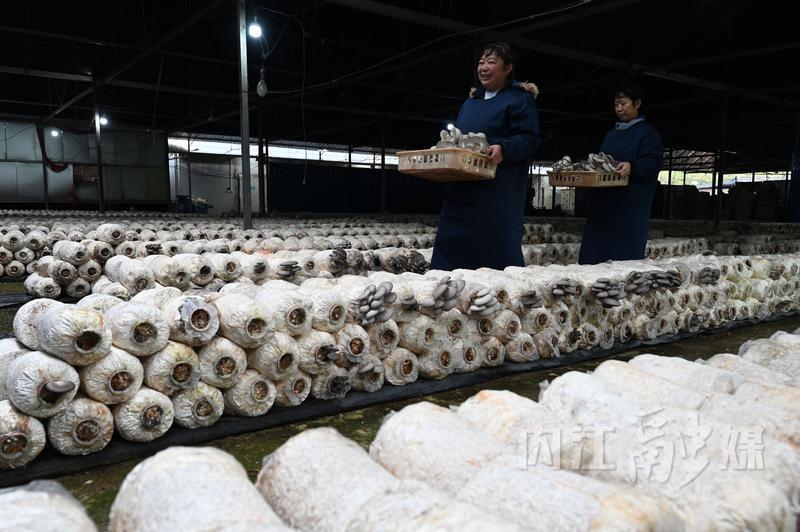 12月5日,东兴区双桥镇元觉村桑枝菌种植基地内,村民忙着采收桑枝菌。