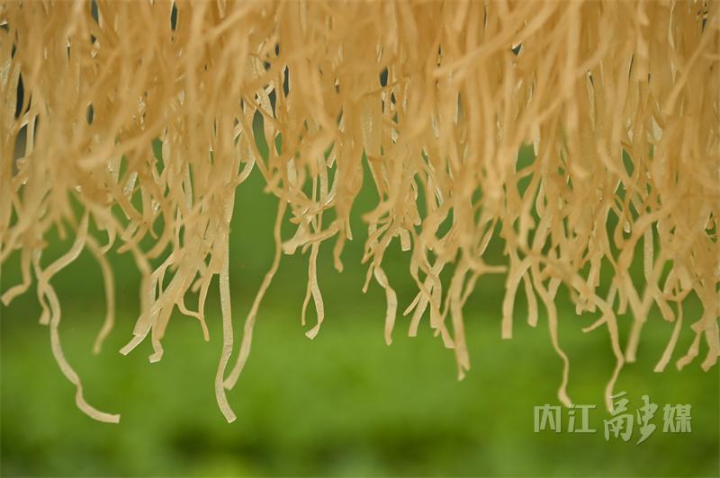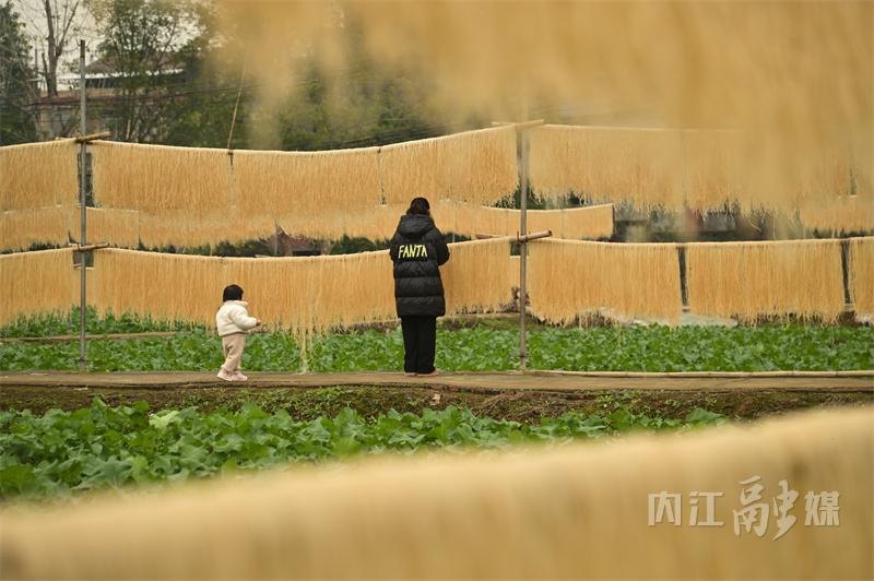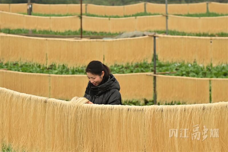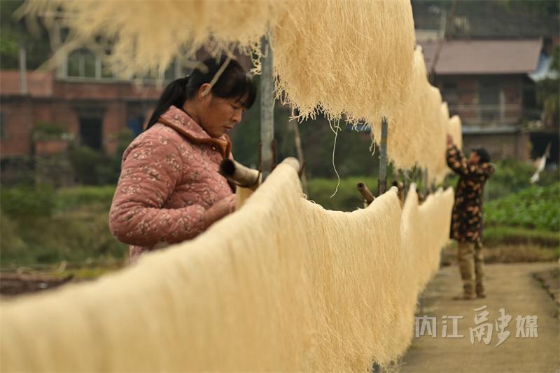 连日来,内江市东兴区郭北镇黄泥村村民抢抓晴好天气晾晒粉条,金灿灿的“粉条幕墙”成了乡村冬日里一道道亮丽的风景线。